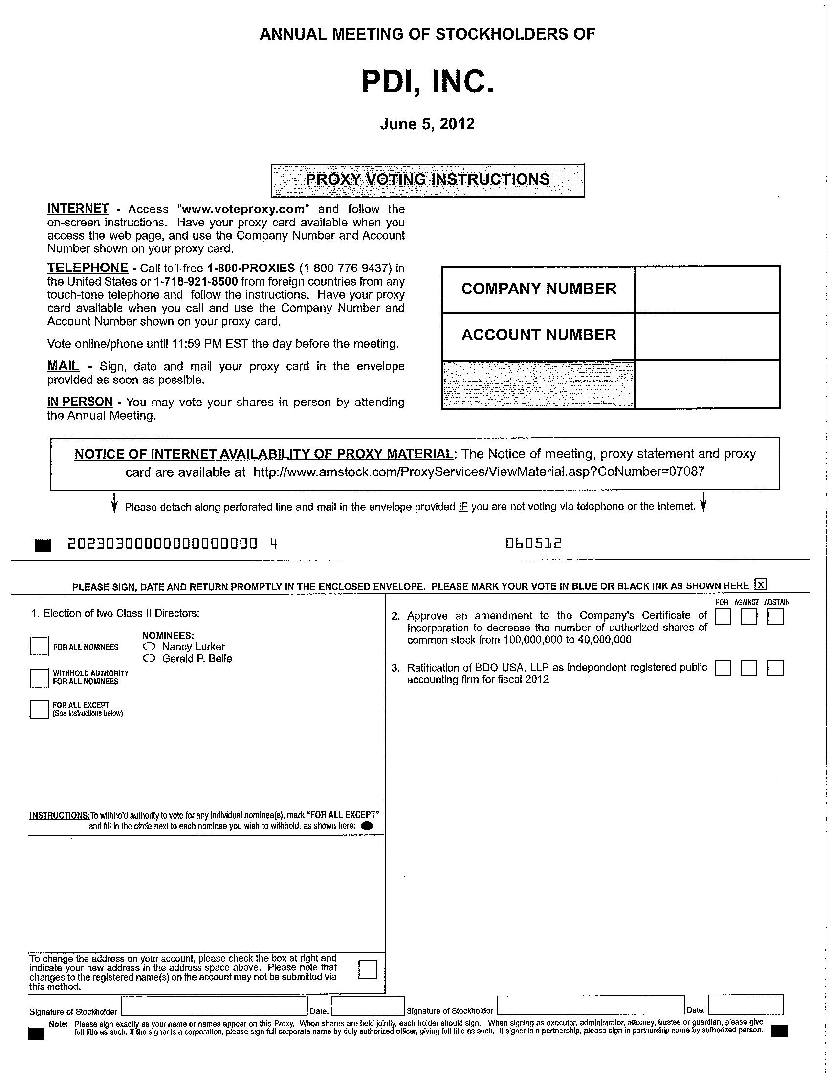 NOTICE IS HEREBY GIVEN that the Annual Meeting of Stockholders of PDI, Inc. (“PDI” or the “Company”) will be held at our corporate headquarters located at Morris Corporate Center One, 300 Interpace Parkway, Building A, Parsippany, New Jersey 07054 on June 5, 2012 at 4:00 p.m., Eastern Daylight time. At the Annual Meeting, you will be asked: