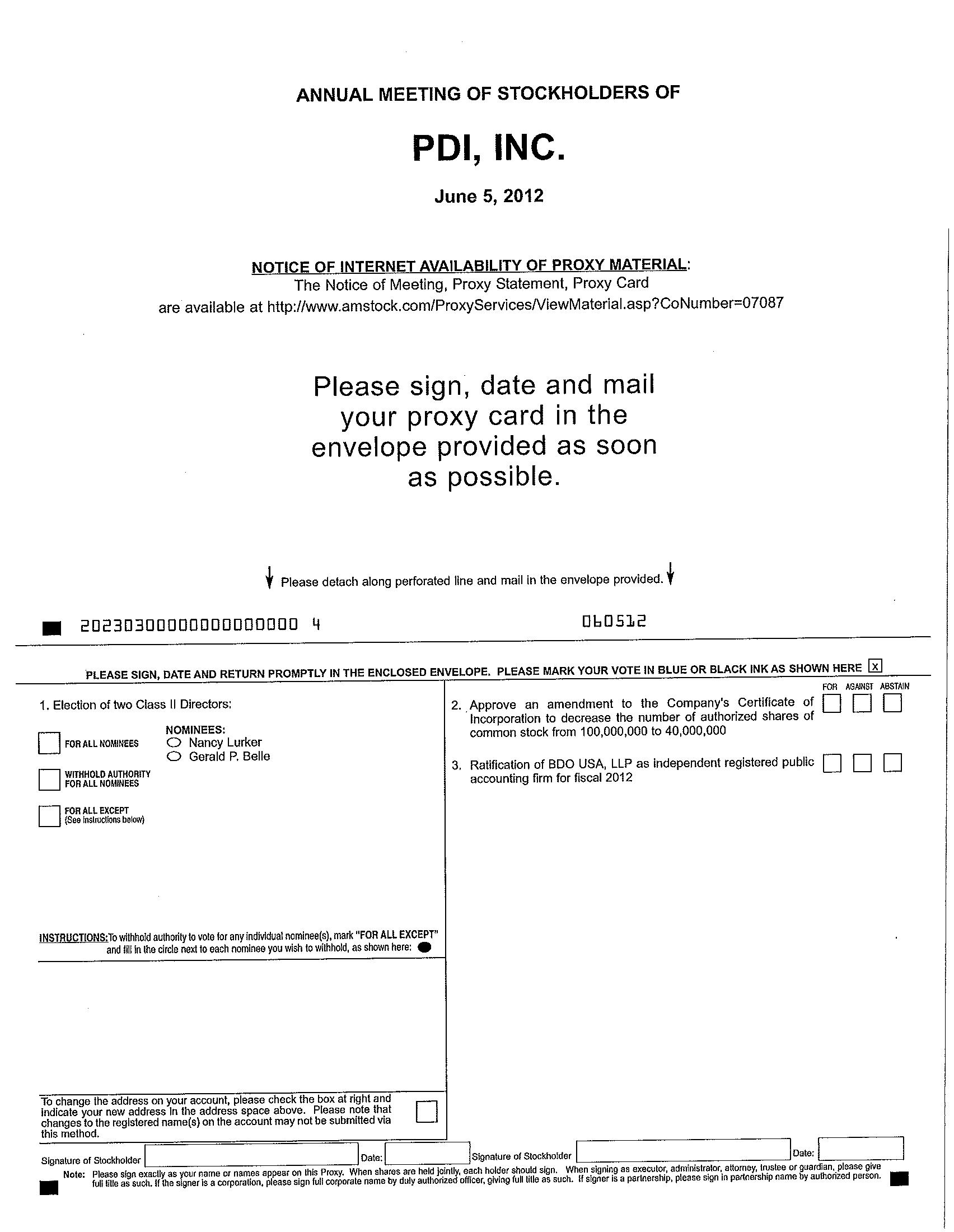 The accompanying Notice of Annual Meeting, Proxy Statement and proxy card provide information about PDI in addition to describing the business we will conduct at the Annual Meeting. We urge you to read this information carefully.