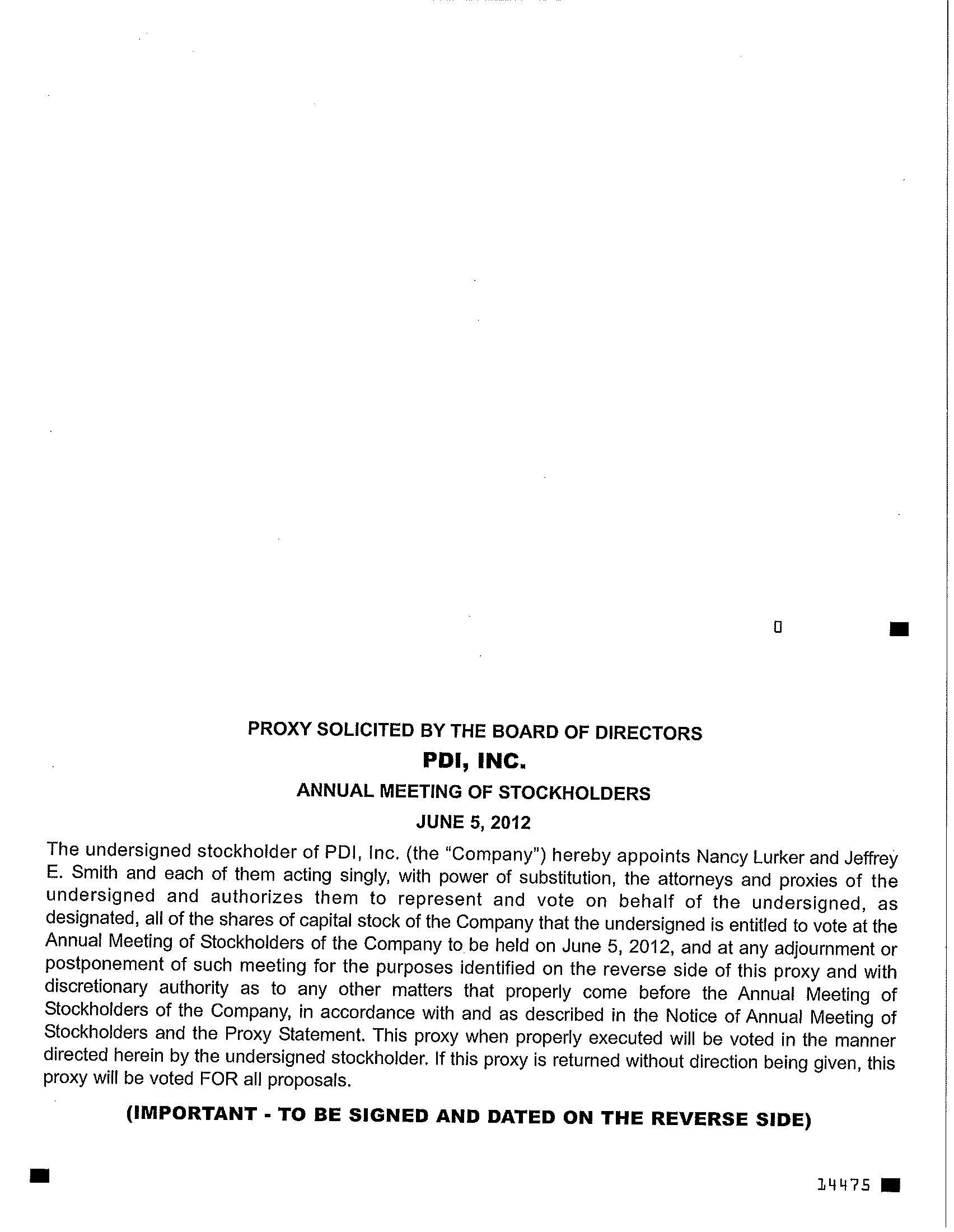 This Proxy Statement is furnished in connection with the solicitation by the Board of Directors of PDI, Inc., a Delaware corporation (the “Company”, “PDI”, “we”, “us” or “our”), of proxies in the form enclosed for the Annual Meeting of Stockholders to be held at PDI's corporate headquarters located at Morris Corporate Center One, 300 Interpace Parkway, Building A, Parsippany, New Jersey 07054 on June 5, 2012 at 4:00 p.m., Eastern Daylight time, and for any adjournment or postponement thereof (the “Annual Meeting”), for the purposes set forth in the accompanying Notice of Annual Meeting of Stockholders. Our Board of Directors knows of no other business which will come before the Annual Meeting. This Proxy Statement will be mailed to stockholders on or about April 25, 2012.