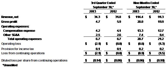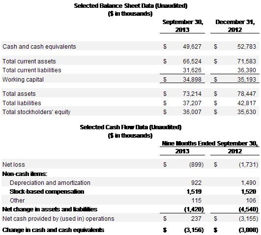 Liquidity and Cash Flow- Adjusted EBITDA (a non-GAAP measure defined in the release) for the third quarter of 2013 was $(1.3) million compared to $0.2 million in the third quarter of 2012. Adjusted EBITDA year to date was $1.8 million as compared to $1.7 million last year. Cash and cash equivalents at the end of the third quarter were $49.6 million, down $3.2 million from December 31, 2012, due primarily to working capital changes and capital expenditures.