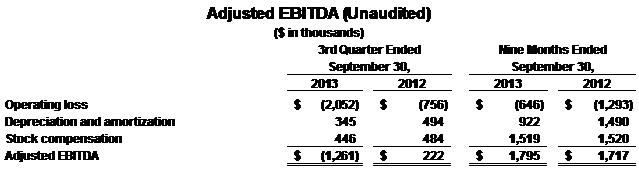 • | Adjusted EBITDA (a non-GAAP financial measure) of $(1.3) million for the 2013 third quarter and $1.8 million for the nine months of 2013 |