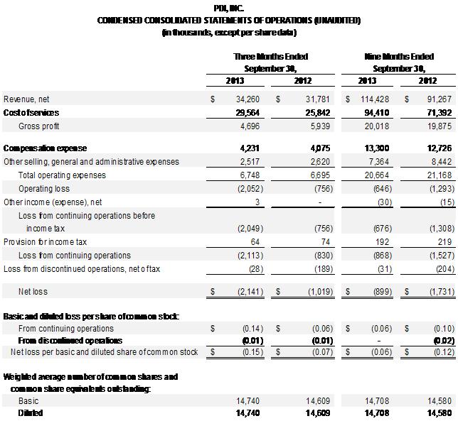 PDI Reports Third Quarter 2013 Financial Results