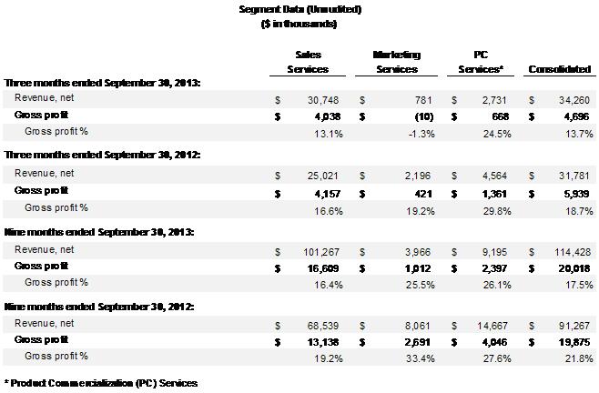 Revenue- For the third quarter of 2013, revenue of $34.3 million was $2.5 million or 8% higher than the third quarter of 2012 driven by an increase in the company’s Sales Services segment.