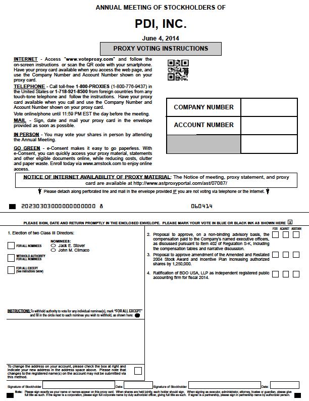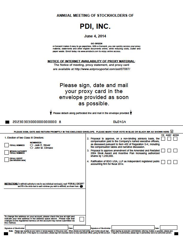 NOTICE IS HEREBY GIVEN that the Annual Meeting of Stockholders of PDI, Inc. (“PDI” or the “Company”) will be held at our corporate headquarters located at Morris Corporate Center One, 300 Interpace Parkway, Building A, Parsippany, New Jersey 07054 on June 4, 2014 at 4:00 p.m., Eastern Daylight time. At the Annual Meeting, you will be asked: