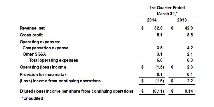 Revenue- For the first quarter of 2014, revenue of $32.8 million was $10.1 million or 24% lower than the first quarter of 2013 driven by the natural expiration or reduction of contracts being executed in 2014 exceeding new contracts entered into in the company’s Sales Services segment.