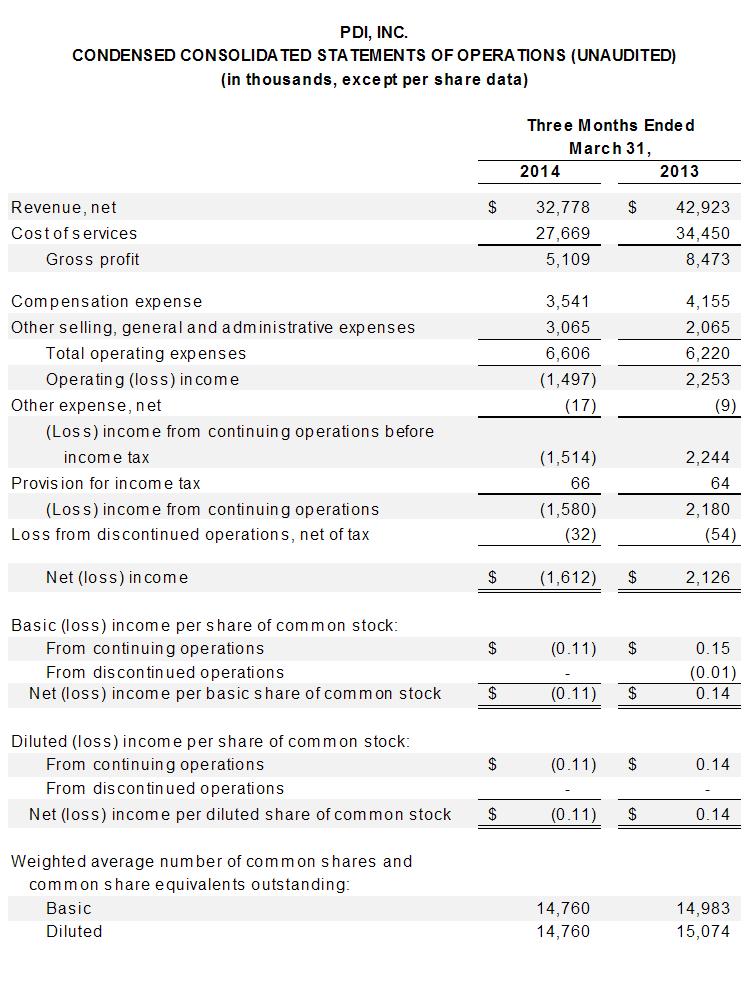 Parsippany, N.J., May 7, 2014 - PDI, Inc. (Nasdaq: PDII), today reported financial and operational results for the first quarter ended March 31, 2014. Summary financial and operational accomplishments include: