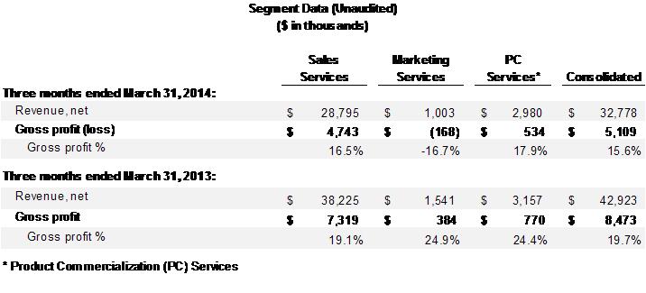 • | Marketing Services gross profit for the first quarter of 2014 was a negative $0.2 million due to the decrease in revenue and increased costs associated with the announced launch of our new product, PD OneTM. |