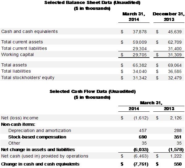 Liquidity and Cash Flow- Adjusted EBITDA (a non-GAAP measure defined in the release) for the first quarter of 2014 was $(0.4) million compared to $2.9 million in the first quarter of 2013. Cash and cash equivalents at the end of the year were $37.9 million, down $7.8 million from December 31, 2013 due primarily to increases in working capital requirements, timing of certain payments from customers and investments in our strategic initiatives.