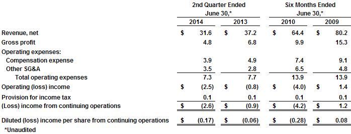 Operating Income/Loss- The operating loss for the second quarter of 2014 was $2.5 million, compared to $0.8 million for the same period in 2013. The 2014 operating loss was primarily the result of the anticipated lower revenue and margins as well as the company’s investment in strategic initiatives.