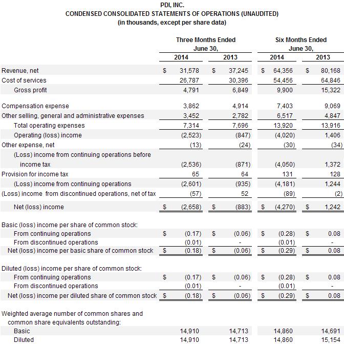 Parsippany, N.J., August 13, 2014 - PDI, Inc. (Nasdaq: PDII), today reported financial and operational results for the second quarter ended June 30, 2014. Summary financial and operational accomplishments include: