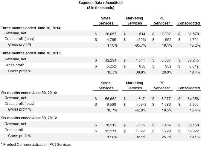 Revenue- For the second quarter of 2014, revenue of $31.6 million was $5.7 million or 15% lower than the second quarter of 2013 driven by the natural expiration or reduction of contracts being executed in 2014 exceeding new contracts entered into in the company’s Sales Services segment.