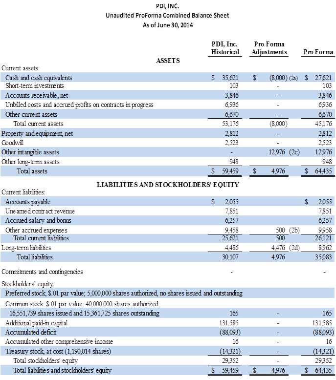 The unaudited pro forma condensed consolidated balance sheet is presented for informational purposes only and should be read in conjunction with the historical consolidated financial statements and accompanying notes of the Company, which are included in the Annual Report on Form 10-K of PDI, Inc. for the year ended December 31, 2013. The assumptions and adjustments used are described in the accompanying notes to the unaudited pro forma condensed combined financial statements.