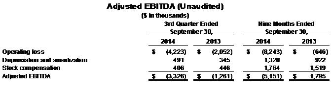 Liquidity and Cash Flow- Adjusted EBITDA (a non-GAAP measure defined in the release) for the third quarter of 2014 was $(3.3) million compared to $(1.3) million in the third quarter of 2013. Cash and cash equivalents at the end of the third quarter were $27.0 million, down $18.6 million from December 31, 2013 due primarily to investments in our strategic initiatives, including the acquisition of Asuragen assets, and increases in working capital requirements. The company estimates year-end 2014 cash of $21-$23 million including the acquisitions of Asuragen assets and RedPathas well as funding from the company’s financing agreement.