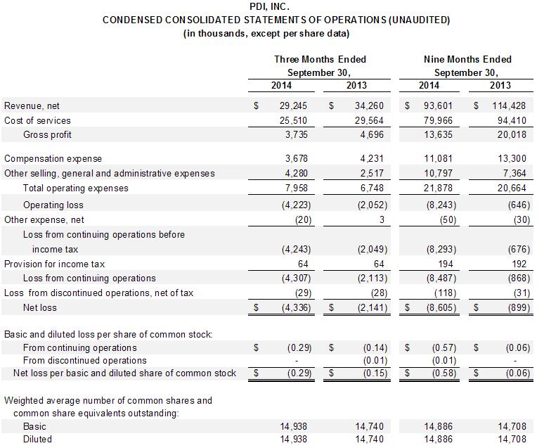 Parsippany, N.J., November 3, 2014 - PDI, Inc. (Nasdaq: PDII), today reported financial and operational results for the fiscal third quarter ended September 30, 2014. Developments during the quarter and recent weeks subsequent to the quarter include: