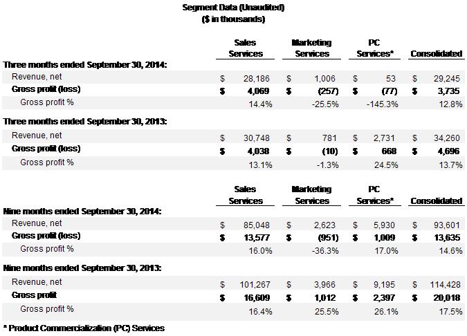 • | Marketing Services gross profit for the third quarter of 2014 was a negative $0.3 million due primarily to the costs associated with right-sizing the Group DCA work force. |