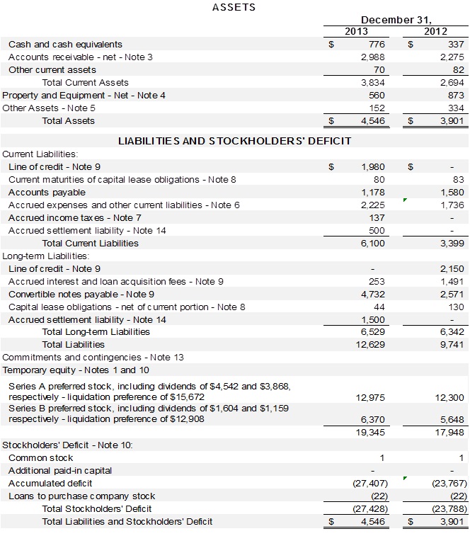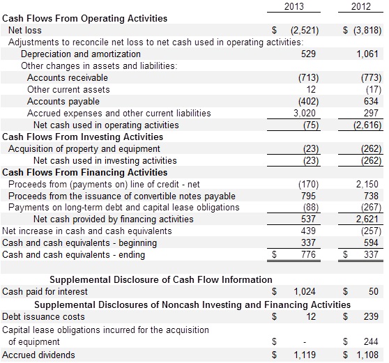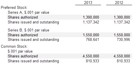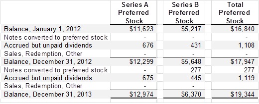 The Company issued convertible notes to investors aggregating $795 in 2013 ($613 in April 2013 and $182 in October 2013) and $738 in July 2012. Prior to 2012, the Company issued convertible notes aggregating $1,848 to the same investors. Also in 2013, $277 of convertible notes was converted into 37,645 shares of Series B preferred stock.
