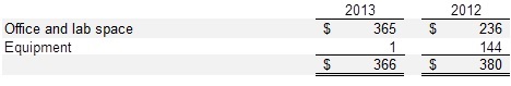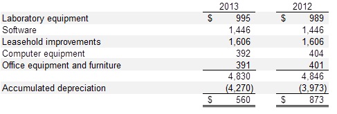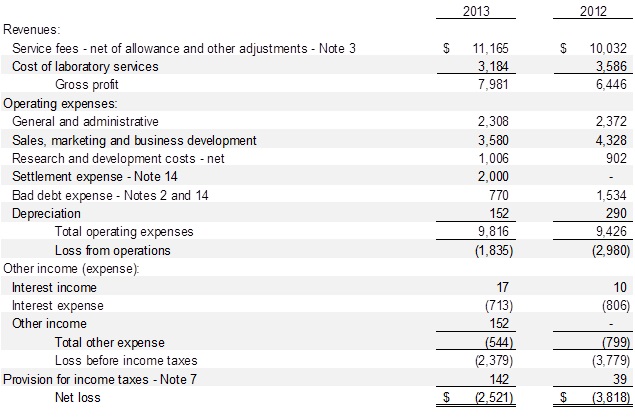 Depreciation expense included in cost of laboratory services was approximately $183 in 2013 and approximately $362 in 2012. Depreciation expense included in operating expenses was approximately $152 in 2013 and $290 in 2012 in the related statements of operations.