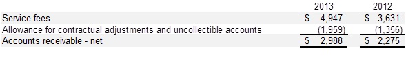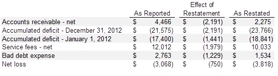 The Company previously recognized certain net service revenue and the related accounts receivable at the Company’s full, established rates less an estimated provision for contractual adjustments and allowances. This policy resulted in net service revenue recorded at the estimated net realizable amounts from third-party payors and others for services rendered. In 2013, management determined that this policy does not accurately reflect certain net service revenue amounts in accordance with generally accepted accounting principles. In addition, in 2013, management determined that certain amounts previously recorded as bad debt expense should have been recorded as a reduction of revenue. The Company has changed its method of accounting for these items and restated its 2012 financial statements for the correction of this misstatement. The effects of the restatement on the 2012 financial statements are as follows: