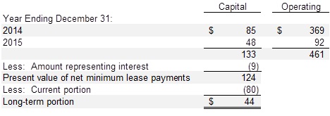 The Company is obligated under a variety of capital leases for equipment acquisitions. The long-term lease obligation represents the present value of the minimum lease payments discounted at rates ranging from 4% to 20%. The capitalized cost of equipment under capital leases is approximately $250 less accumulated depreciation of approximately $38 at December 31, 2013. Depreciation expense on this equipment was approximately $64 and interest expense was approximately $14 in 2013.