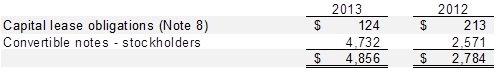 In March 2013, the principal amount of the existing convertible notes of $2,571, accrued interest and accrued loan fees of $1,643, and additional proceeds received from existing investors of $613 were converted into a new series of convertible notes. The principal amount of the new series of notes accrues interest at 8%. The new series of convertible notes have the same payment and conversion terms as the previously issued convertible notes. The notes are convertible into the shares issued in the next round of equity funding. The notes are mandatorily convertible upon a qualified financing event, as defined in the note agreement or upon the election of the majority of the note holders. The notes are also convertible at the option of the note holder upon a non-qualified issuance of securities, as defined in the agreement or upon acquisition of the Company. Prior to conversion, the previous series of notes accrued interest at 18%. The new series of convertible notes mature on April 30, 2015.