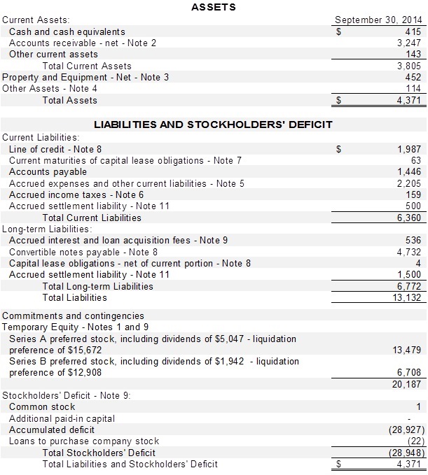 The Company has a revolving line-of-credit agreement with a bank that provides for maximum borrowings of $3,000. The Company has the ability to request advances based on a formula defined in the line-of-credit agreement. Outstanding borrowings under the line bear interest at the prime rate (3.25% at September 30, 2014) plus 1%, but not less than a minimum interest rate of 5%.