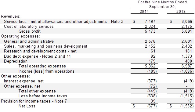 Depreciation expense included in cost of laboratory services was approximately $94 in 2014 and approximately $137 in 2013. Depreciation expense included in operating expenses was approximately $76 in 2014 and approximately $113 in 2013.