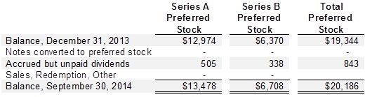 The Series A preferred stock has priority over common stock with respect to dividends, redemption and liquidation rights, as defined. The Series A liquidation preference is equal to 1.4 times $7.41 per share plus all accrued and unpaid dividends, whether or not declared. The holders of Series A preferred stock are entitled to dividends at an annual rate of 8% of the original Series A issue price. The dividends accrue whether or not earned or declared and are cumulative. A rollforward of the Series A and Series B preferred stock is as follows: