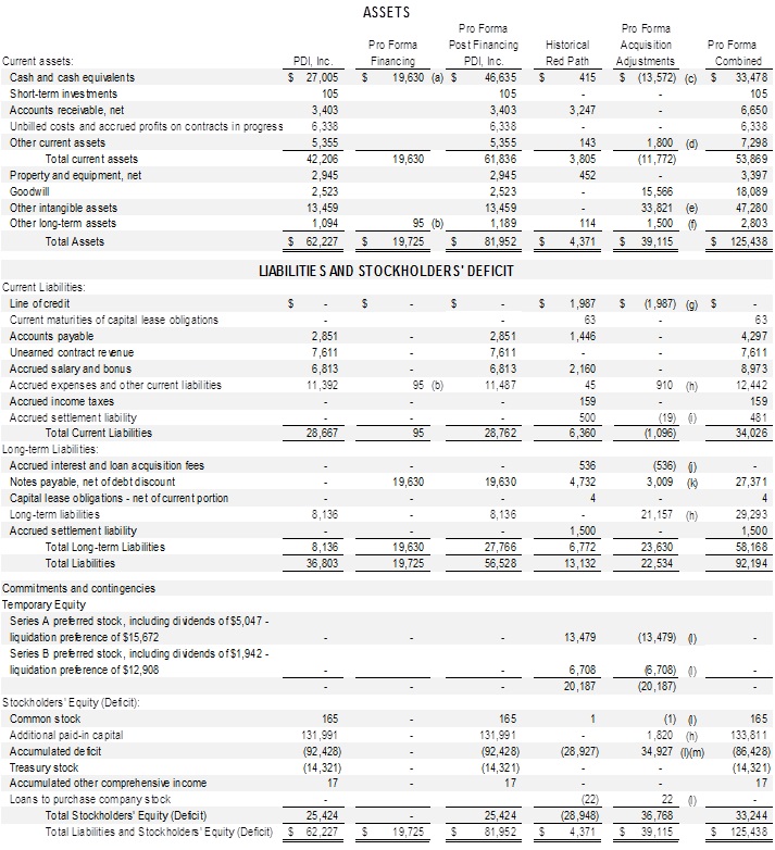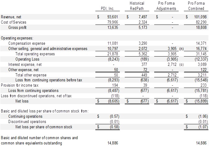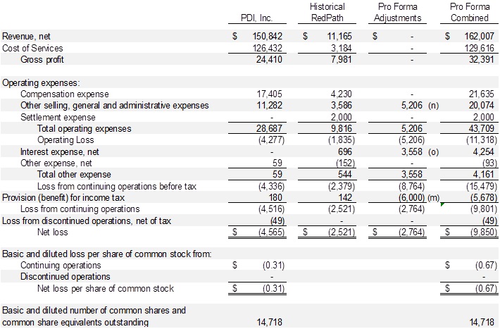 The unaudited pro forma condensed combined financial statements have been prepared for illustrative purposes only and do not purport to reflect the results the combined company may achieve in future periods or the historical result that would have been obtained. The data is not indicative of the operating results or financial position that would have occurred if the transactions had been consummated as of January 1, 2013. Since the entities were not under common control or management for any period presented, the unaudited pro forma condensed combined condensed financial results may not be comparable to, or indicative of, future performance. The unaudited pro forma condensed financial statements should be read in conjunction with the: (i) historical consolidated financial statements and accompanying notes of PDI, Inc., which are included in the Annual Report on Form 10-K of PDI, Inc. for the year ended December 31, 2013; (ii) the historical consolidated financial results of PDI, Inc. included in the Company’s Quarterly Report on Form 10-Q for the quarter ended September 30, 2014; (iii) the historical financial statements of Redpath Integrated Pathology, Inc.; and (iv) the unaudited condensed financial statements of Redpath Integrated Pathology, Inc. as of September 30, 2014 and for the nine months ended September 30, 2014 and 2013 included in this 8-K/A.