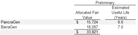(e) | Other intangible assets represent the finite-lived identified intangible assets recognized in the Transaction. The preliminary allocation of fair value to these identified intangible assets was based on the application of relief from royalty valuation approach. The preliminary purchase price allocation is as follows: |