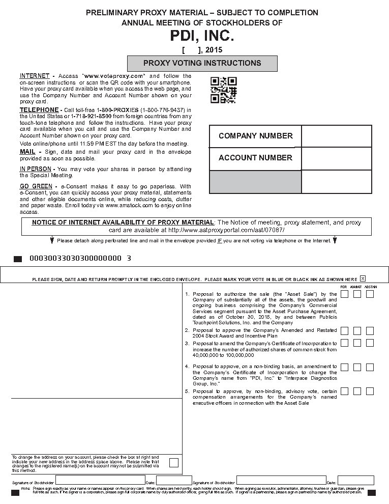 NOTICE IS HEREBY GIVEN that a Special Meeting of Stockholders of PDI, Inc., a Delaware corporation (“PDI”), will be held on , 2015 at 9:00 a.m., local time, at PDI’s corporate headquarters located at Morris Corporate Center One, 300 Interpace Parkway, Building A, Parsippany, NJ 07054, to consider and act upon the following matters: