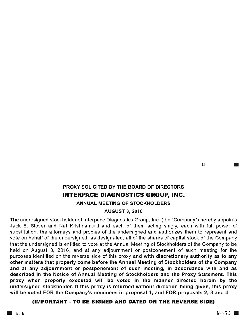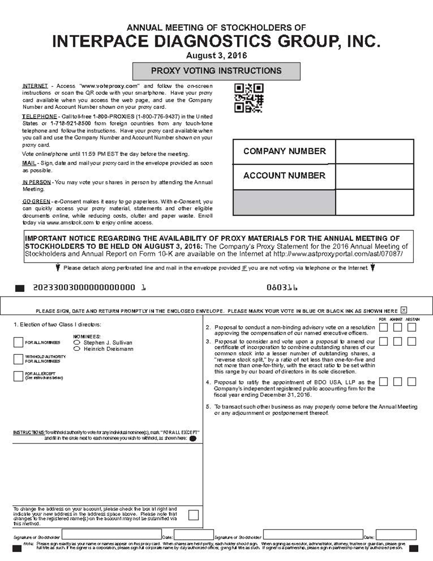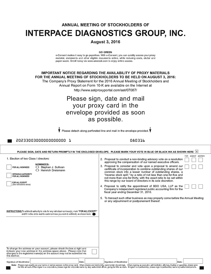 It is my pleasure to invite you to attend Interpace Diagnostics Group, Inc.’s (“Interpace”) Annual Meeting of Stockholders to be held on August 3, 2016, at 11:00 a.m., Eastern Time. The Annual Meeting will be held at the office of our legal counsel, Pepper Hamilton LLP, located at The New York Times Building, 37th Floor, 620 Eighth Avenue, New York, New York 10018. During our Annual Meeting, we will discuss each item of business described in the accompanying Notice of Annual Meeting and Proxy Statement and I will present an update on our business operations. There also will be time for questions.
