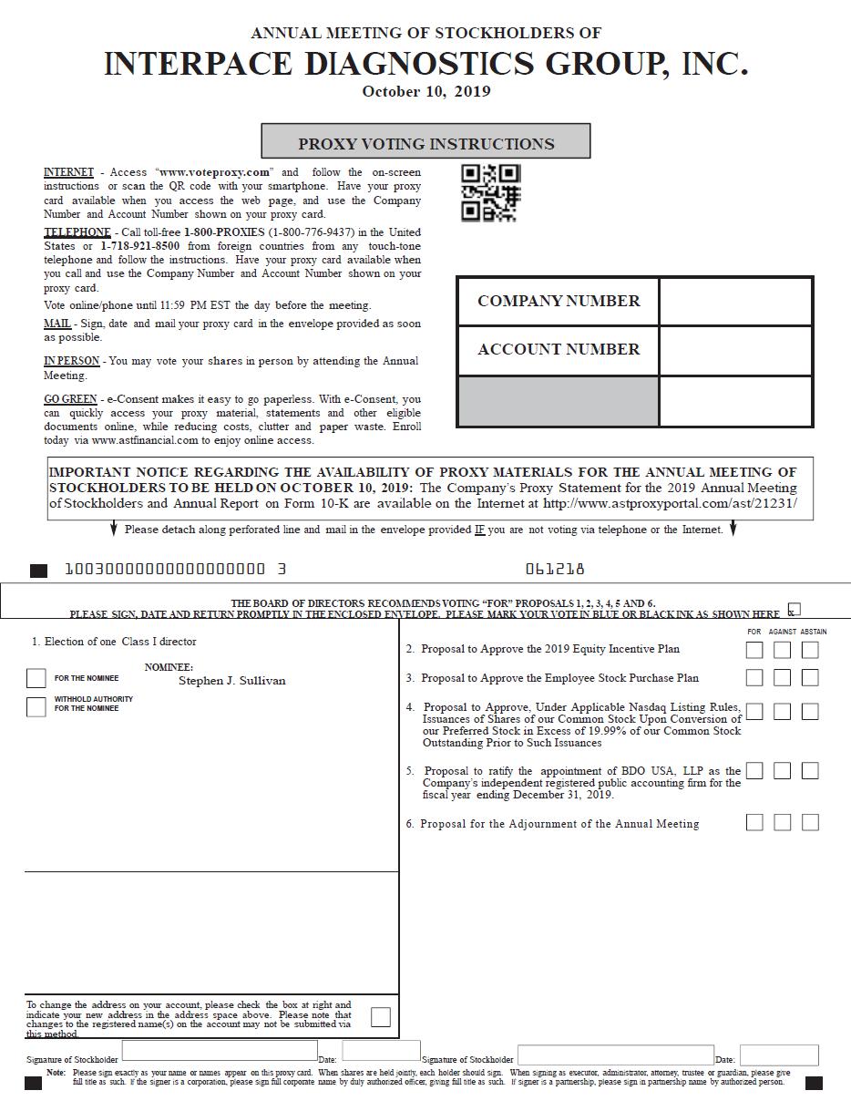 | 2. | Approval of the Interpace Diagnostics Group, Inc. 2019 Equity Incentive Plan, in the form attached as Annex A to this Proxy Statement; |
