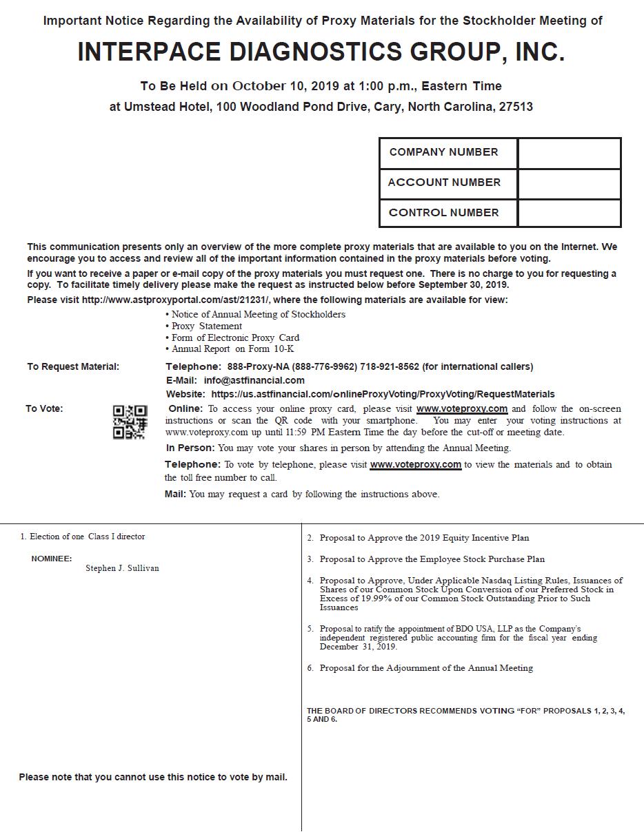It is my pleasure to invite you to attend Interpace Diagnostics Group, Inc.’s (“Interpace”) Annual Meeting of Stockholders to be held on October 10, 2019, at 1:00 p.m., Eastern Time (the “Annual Meeting”). The Annual Meeting will be held at the Umstead Hotel, 100 Woodland Pond Drive, Cary, North Carolina, 27513. During our Annual Meeting, we will discuss each item of business described in the Notice of Annual Meeting and Proxy Statement and as time permits, we will discuss our business operations. There also will be time for questions.