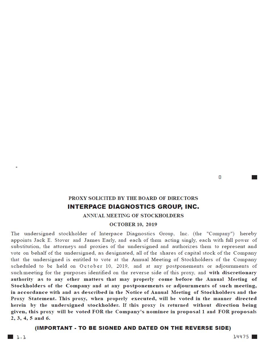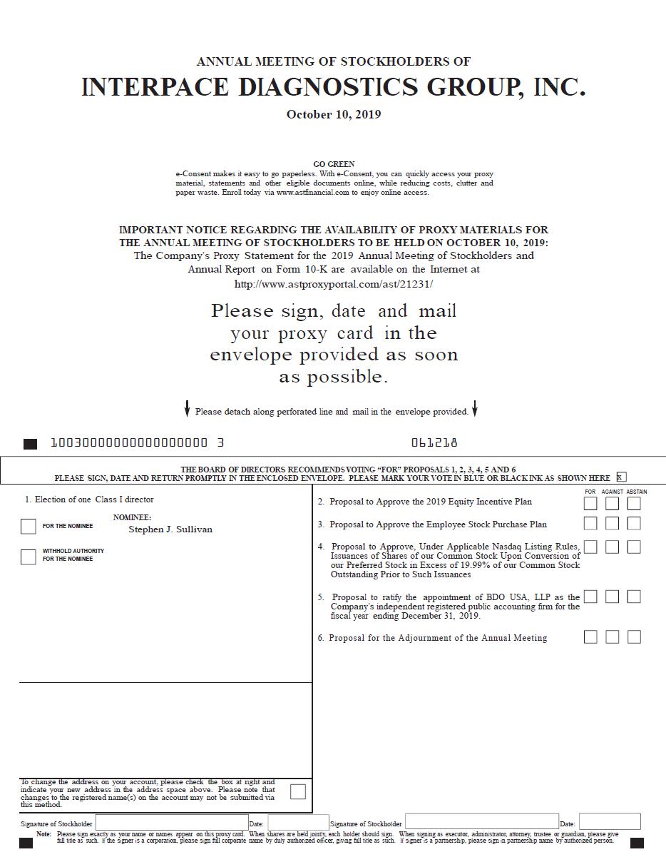 It is my pleasure to invite you to attend Interpace Diagnostics Group, Inc.’s (“Interpace”) Annual Meeting of Stockholders to be held on October 10, 2019, at 1:00 p.m., Eastern Time (the “Annual Meeting”). The Annual Meeting will be held at the Umstead Hotel, 100 Woodland Pond Drive, Cary, North Carolina, 27513. During our Annual Meeting, we will discuss each item of business described in the Notice of Annual Meeting and Proxy Statement and as time permits, we will discuss our business operations. There also will be time for questions.