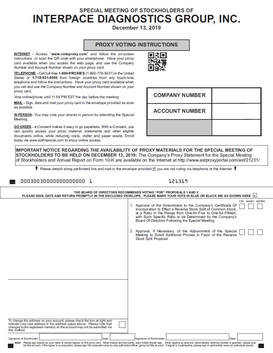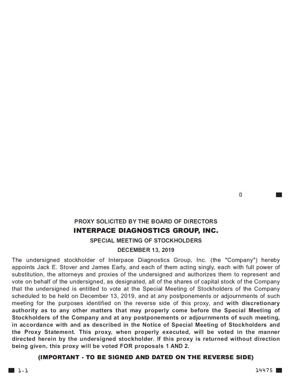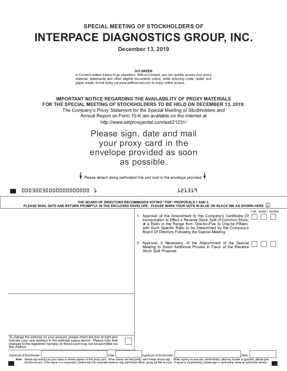 You are cordially invited to attend a Special Meeting of Stockholders (the “Special Meeting”) of Interpace Diagnostics Group, Inc. (“Interpace,” the “Company,” “we” or “us”), to be held at 9:00 a.m., local time, on December 13, 2019, at the offices of our legal counsel, Pepper Hamilton LLP, located at The New York Times Building, 37th Floor, 620 Eighth Avenue, New York, New York 10018.