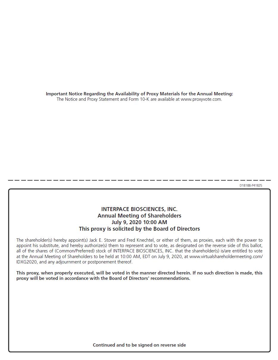 It is my pleasure to invite you to attend Interpace Biosciences, Inc.’s (“Interpace”, the “Company”, “we”, “us” or “our”) Annual Meeting of Stockholders to be held on July 9, 2020, at 10:00 a.m., Eastern Time (the “Annual Meeting”).