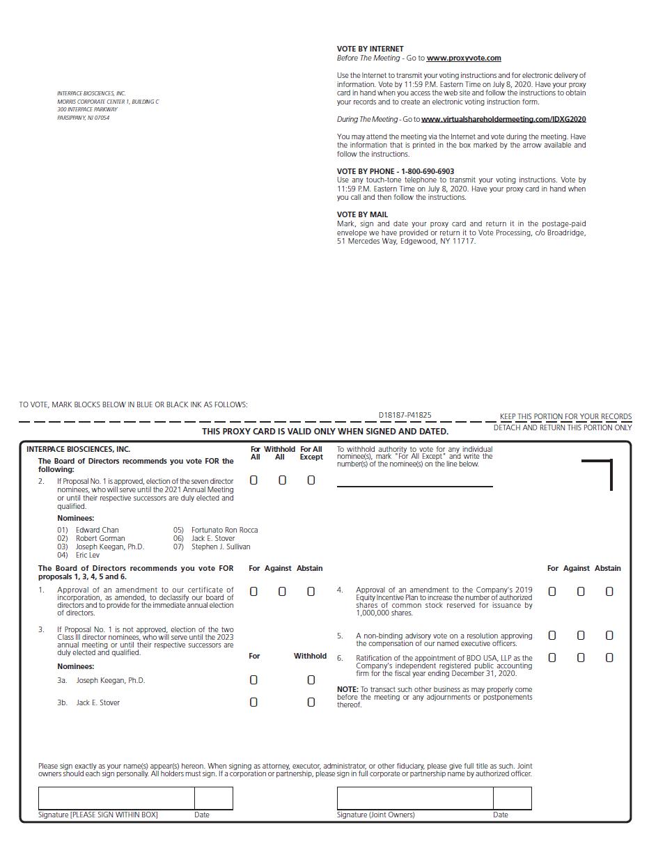 It is my pleasure to invite you to attend Interpace Biosciences, Inc.’s (“Interpace”, the “Company”, “we”, “us” or “our”) Annual Meeting of Stockholders to be held on July 9, 2020, at 10:00 a.m., Eastern Time (the “Annual Meeting”).