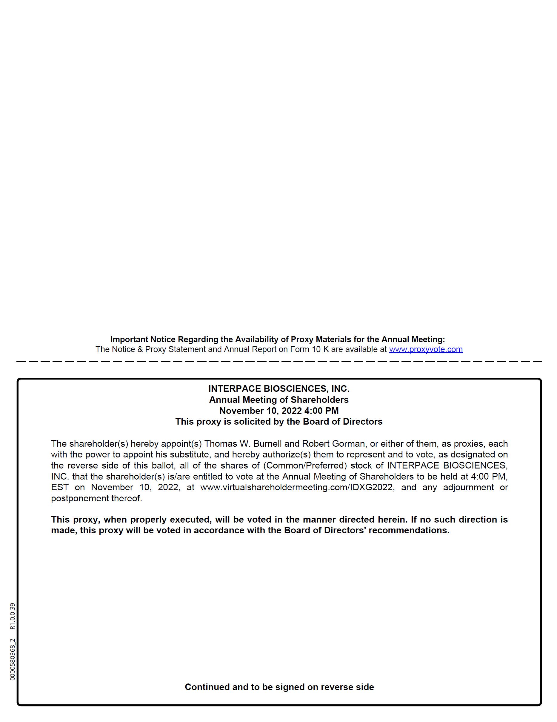 It is my pleasure to invite you to attend Interpace Biosciences, Inc.’s (“Interpace”, the “Company”, “we”, “us” or “our”) Annual Meeting of Stockholders to be held on November 10, 2022, at 4:00 p.m., Eastern Time (the “Annual Meeting”).