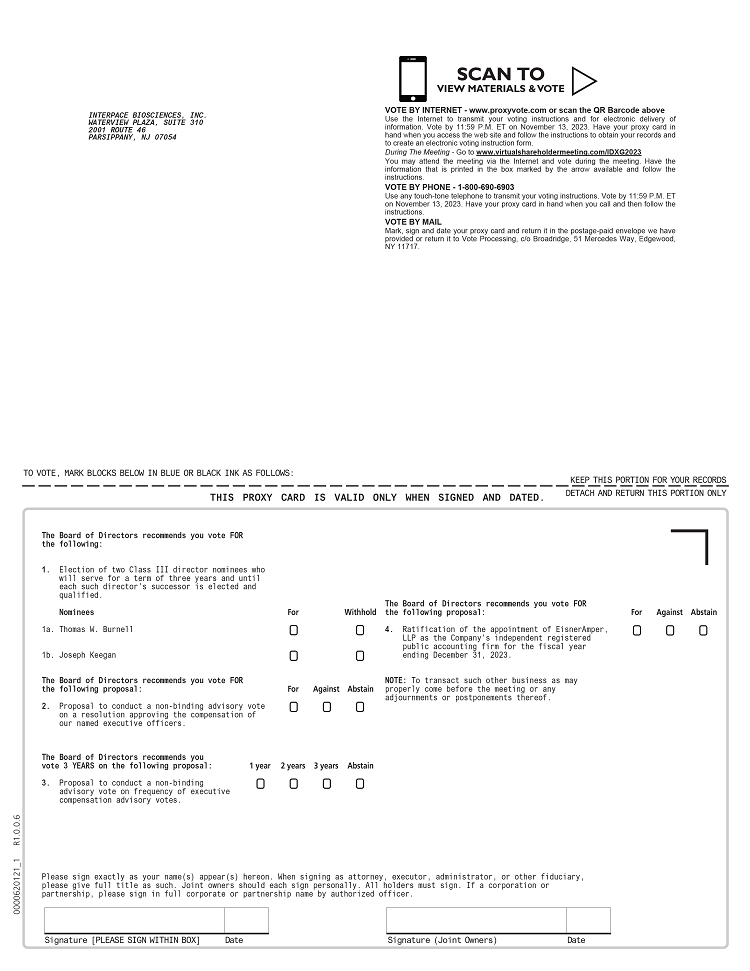 It is my pleasure to invite you to attend Interpace Biosciences, Inc.’s (“Interpace”, the “Company”, “we”, “us” or “our”) Annual Meeting of Stockholders to be held on November 14, 2023, at 4:00 p.m., Eastern Time (the “Annual Meeting”).